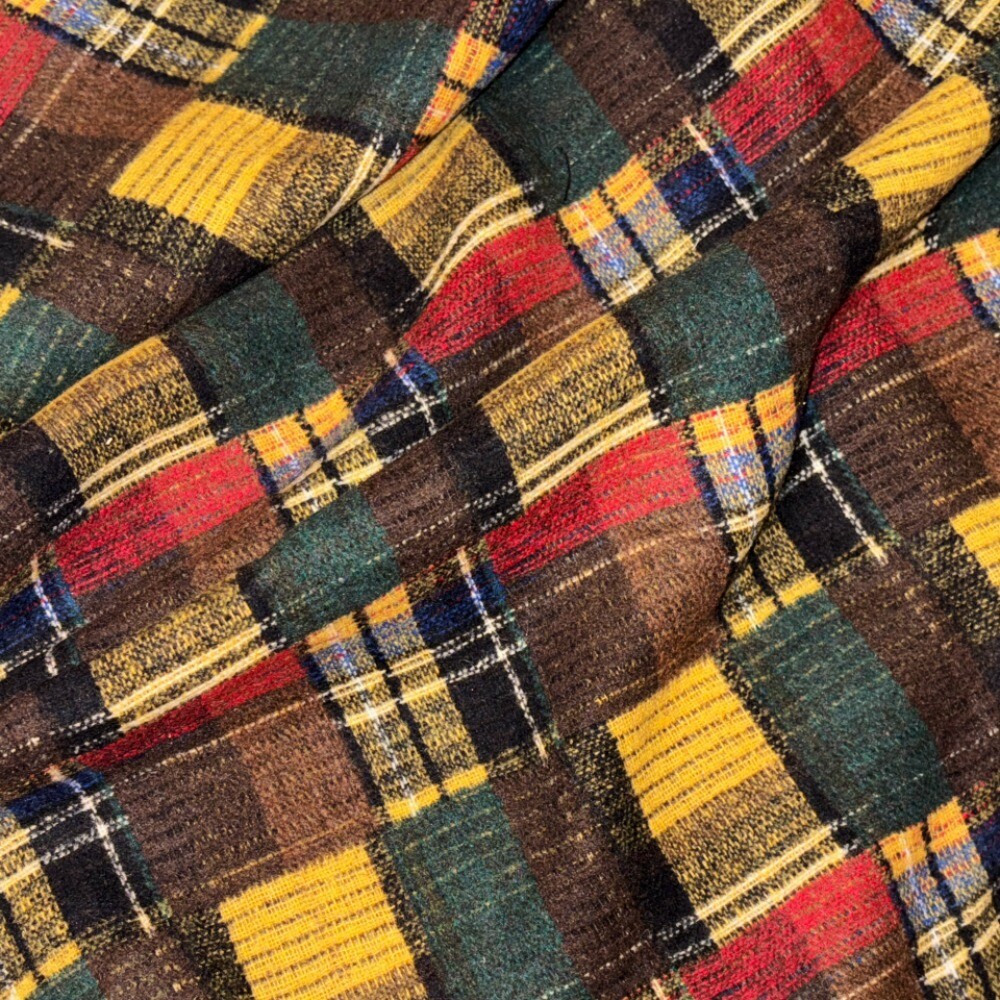 서로 다른 색상의 체크 패턴 원단을 조합하여 마치