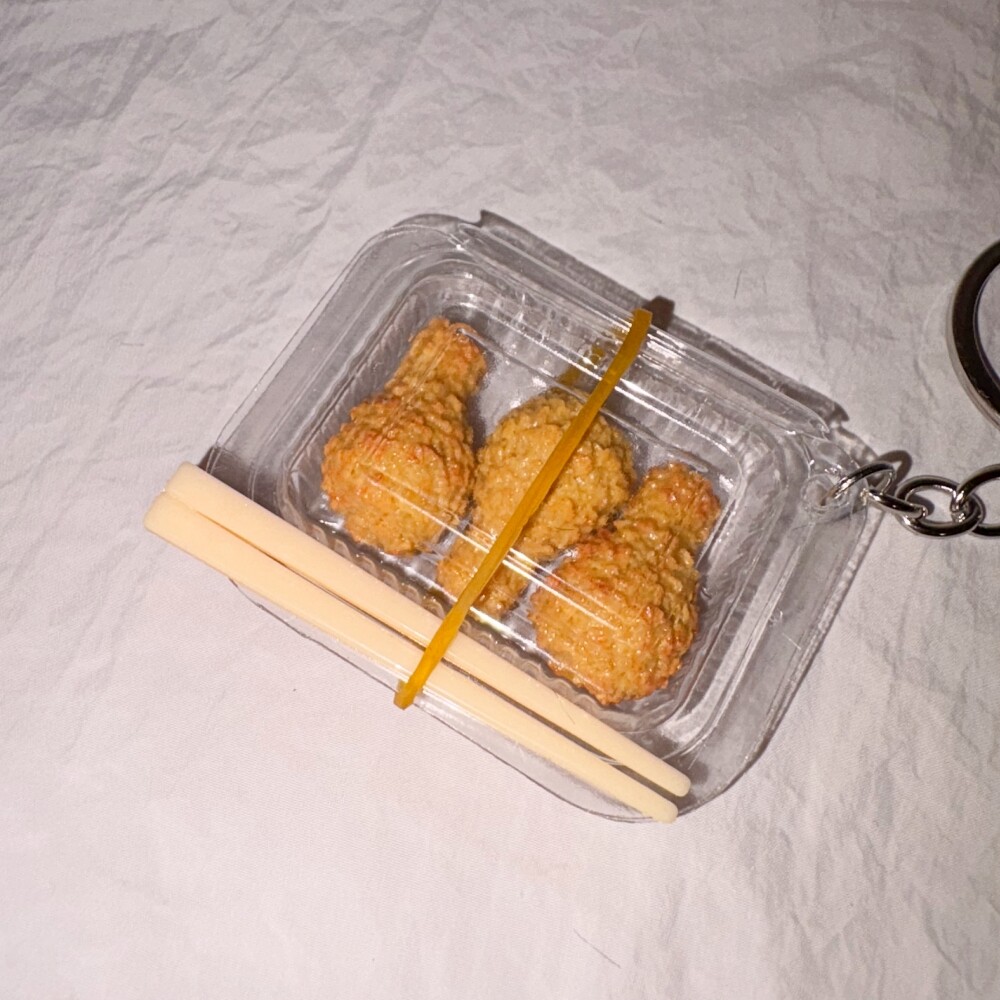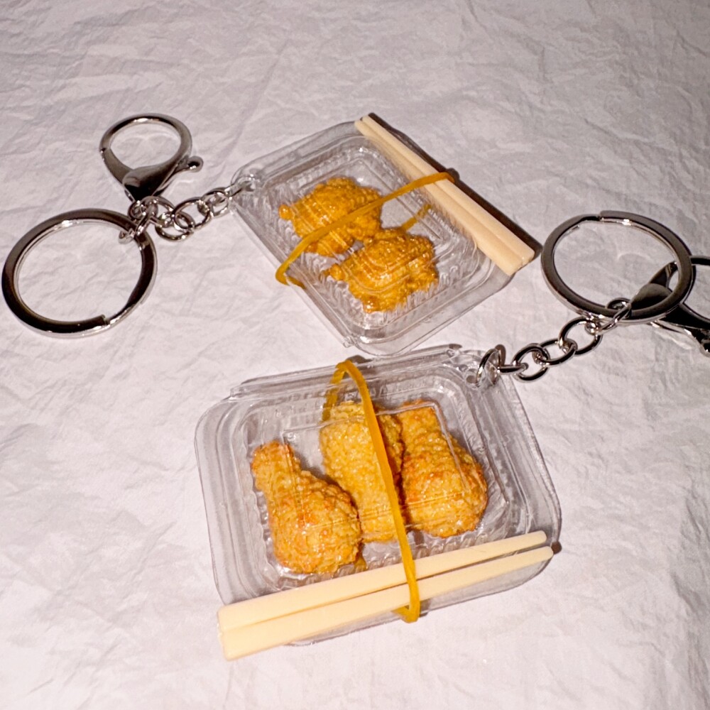 작은 도시락 속에 담긴 치킨 모형으로 완성된 아기자기한 키링이에요.